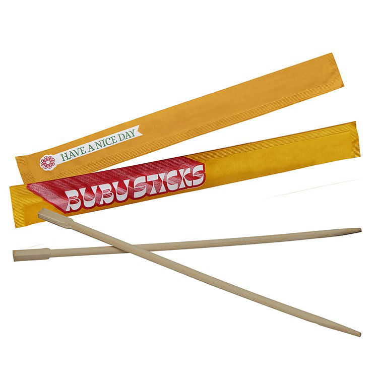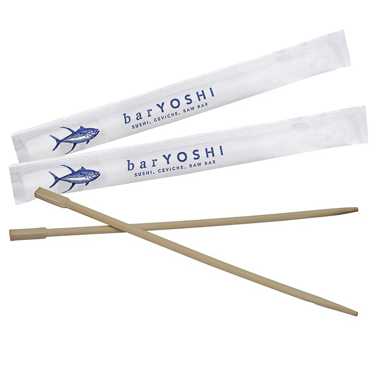 Chopsticks – 1-3 PMS In Color Offset Printing 1 pair of disposable chopsticks made from sustainable bamboo. 1-3 PMS color offset printing on 1 or 2 sides of entire sealed white paper sleeve. “Base Price” Includes 1-Color offset print on 1 or 2 sides of paper sleeve. 9″ L