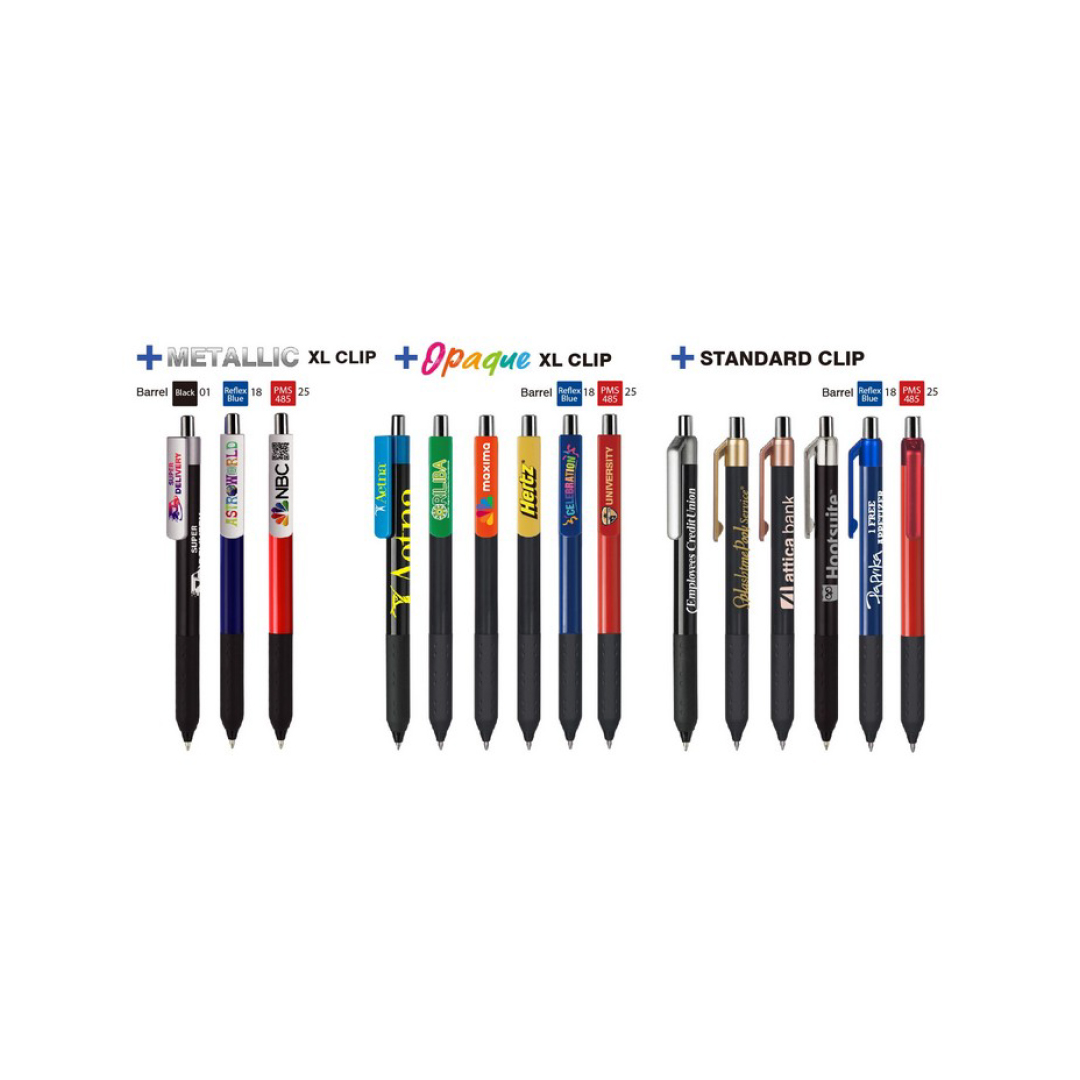 different colors of standard clips. *Full Color Barrel imprint Unavailable. 6″ L x 0.4″ W x 0.6″ H