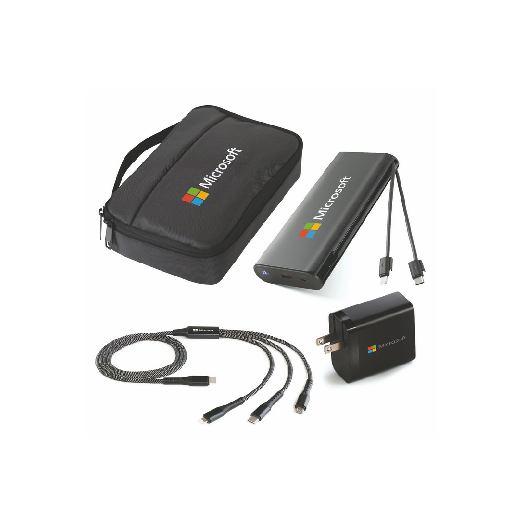 The Executive Laptop Charging Kit is a must-have for tech-savvy professionals and on-the-go individuals. Featuring the Voyager 25,000 mAh Power Bank, which delivers up to 130W of charging power for laptops, tablets, and phones, it ensures your devices stay powered during long days. The kit also includes the AD065 Fast Charging Wall Adapter for rapid charging, the ED878 3-in-1 Charging Cable for versatility across devices, and the P20 Tech Organizer to keep your accessories neatly stored. 6.5″ H x 10.25″ W x 2.25″ Thick