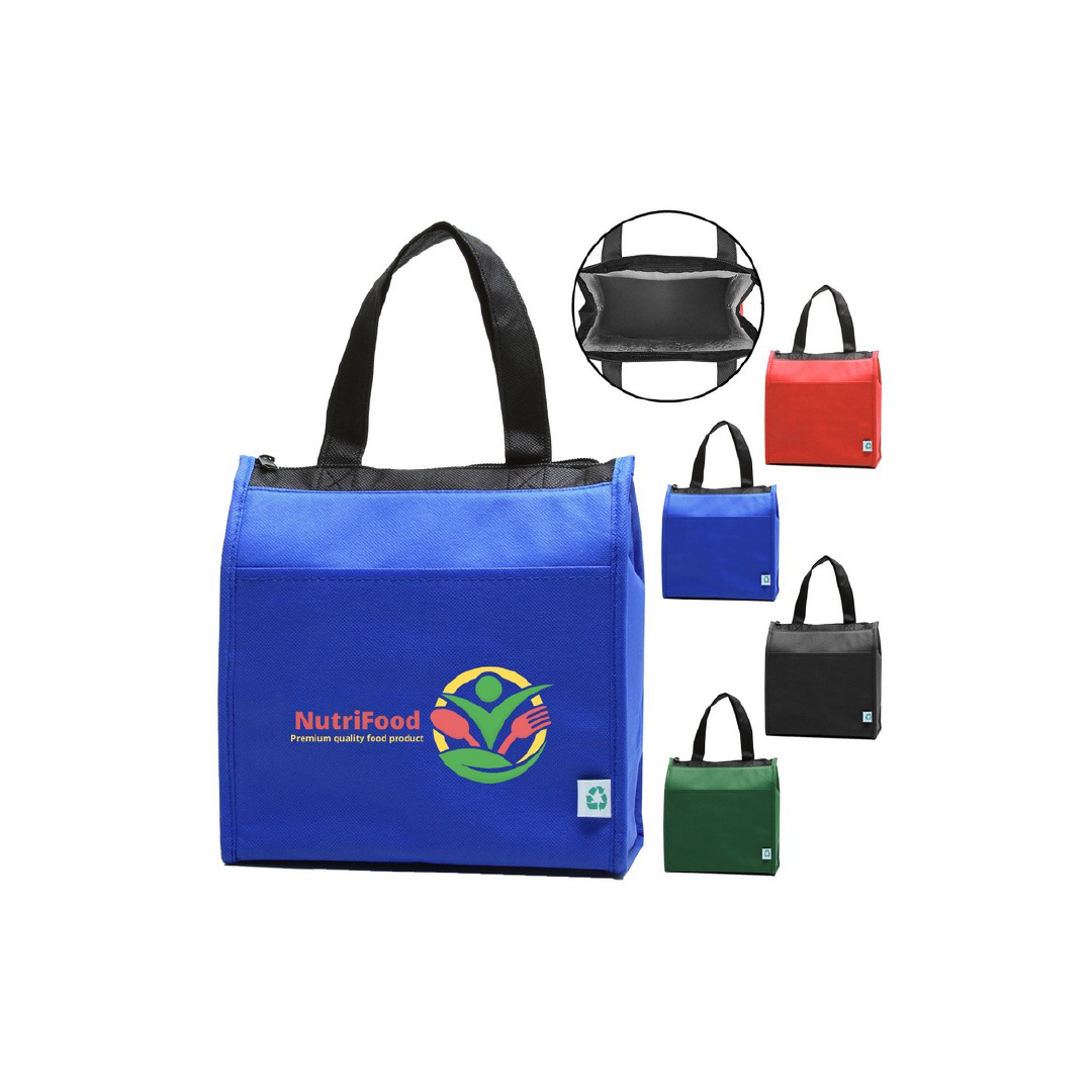 This Insulated Hot/Cold Cooler Tote is a stylish tote that is perfect for the grocery store, supermarket or a day trip to the beach! With its spacious interior and hot/ cold foil lining, keep your drinks cold or your warm food items warm. Easy to use, the handle on this bag measures 12.5″. Great for conventions and trade shows. Purchase includes 1 color 1 location. See website for additional decoration options. 9″ W x 9.5″ H x 4.5″ D