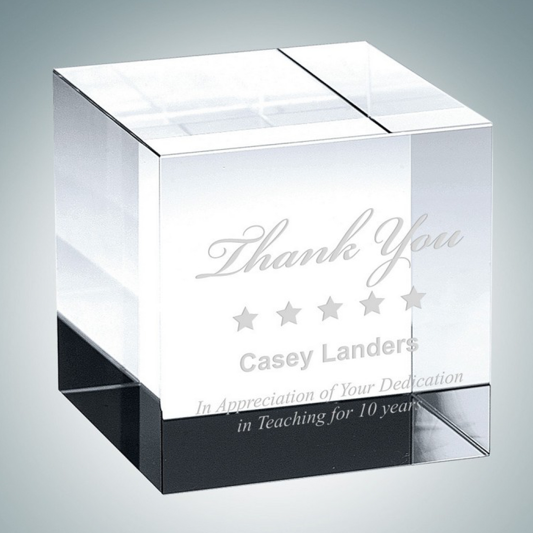 The Optical Crystal Straight Cube Paperweight is a beautiful crystal gift and office award that has many uses. It is a versatile, blank crystal cube that can be engraved with a logo, names and text using a sandblasting engraving technique. It is often used by corporations as an office achievement award, recognition gift for employees or a special retirement gift. 2″ H x 2″ W x 2″ D